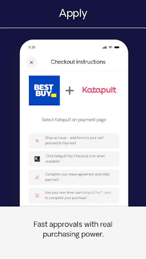 Select Katapult as the payment option in checkout. Start your lease-purchase application and once approved get the flexibility to pay over time, purchase early or even return your items. Katapult … a better way to pay.