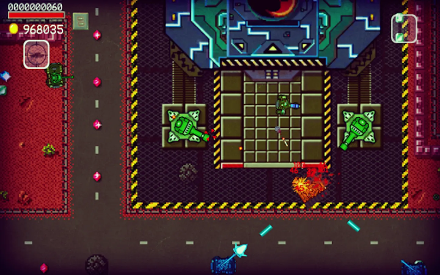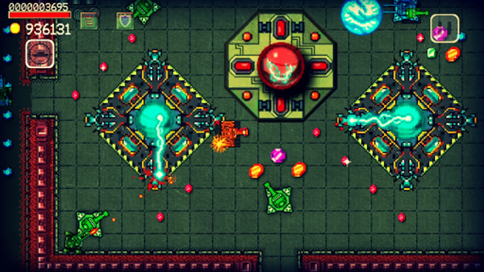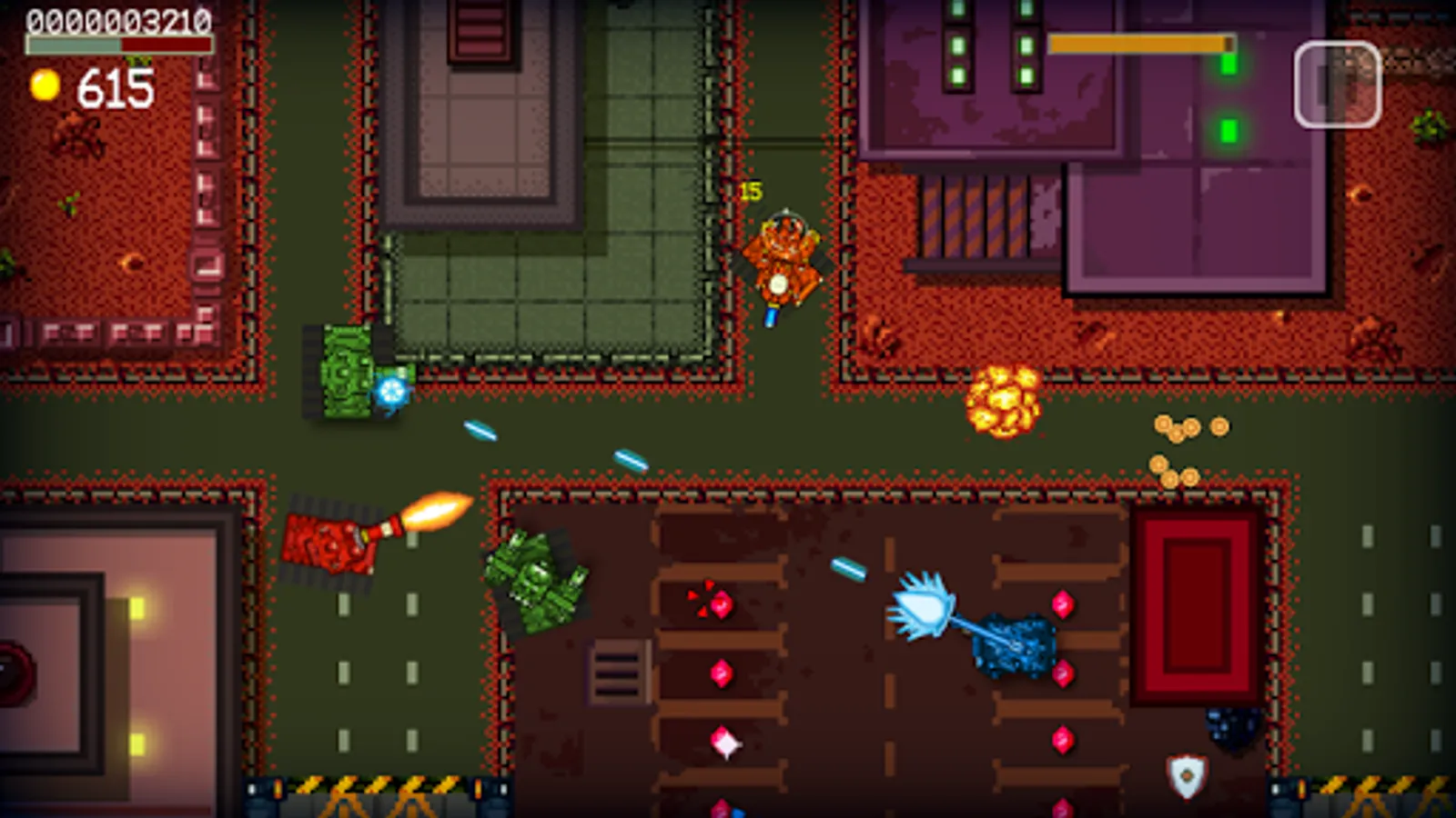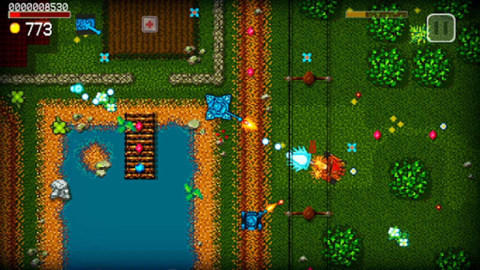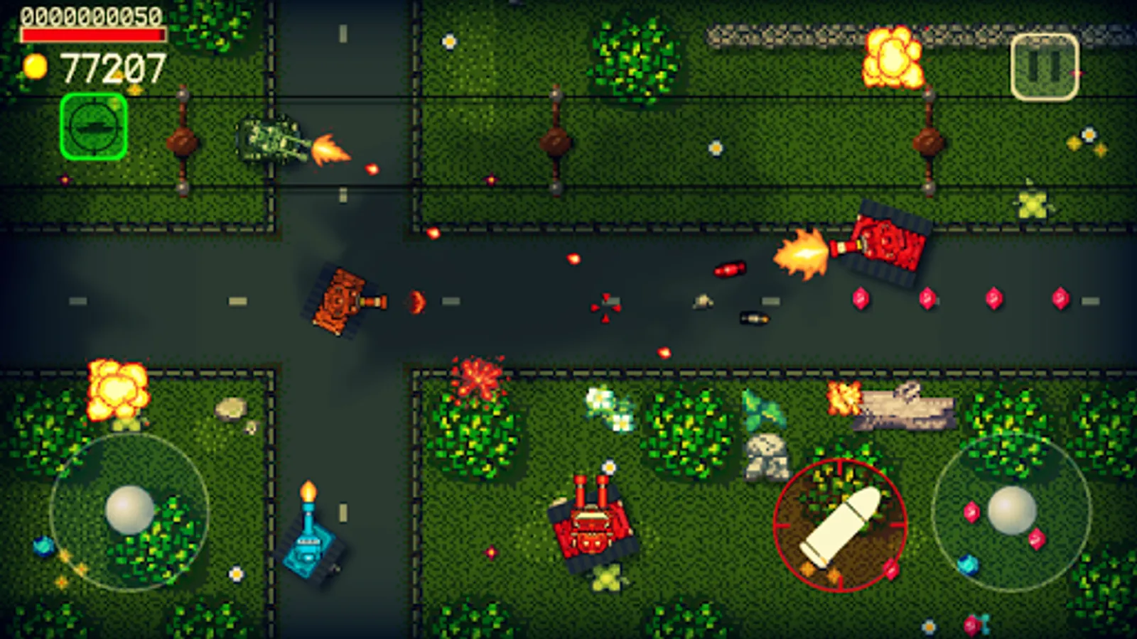 The left stick controls the engine, the right stick controls the tower. The pixel tank on the left side of the screen is the autodisco. Auto aim allows you to conduct an enemy tank, which simplifies aiming. A click on any empty spot on the screen will instantly turn the tank turret in that direction. Do not miss the coins and crystals, they allow you to quickly improve the tunk.