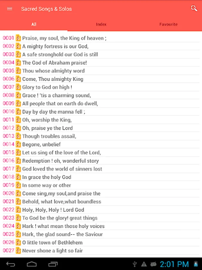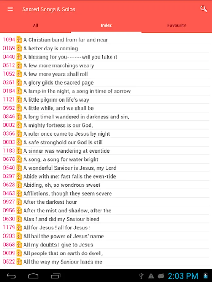 SACRED SONGS AND SOLOS is a lyrics based application containing 1200 hymns. It's used in various churches or Christians gathering to sing hymns of praise to the Almighty God. It has the following features: