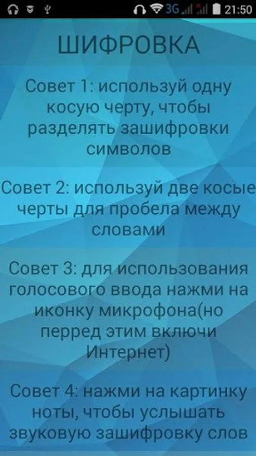This app cah help you learn the Morze code! Here you can translate text to code and decode it, also there is a funny training!