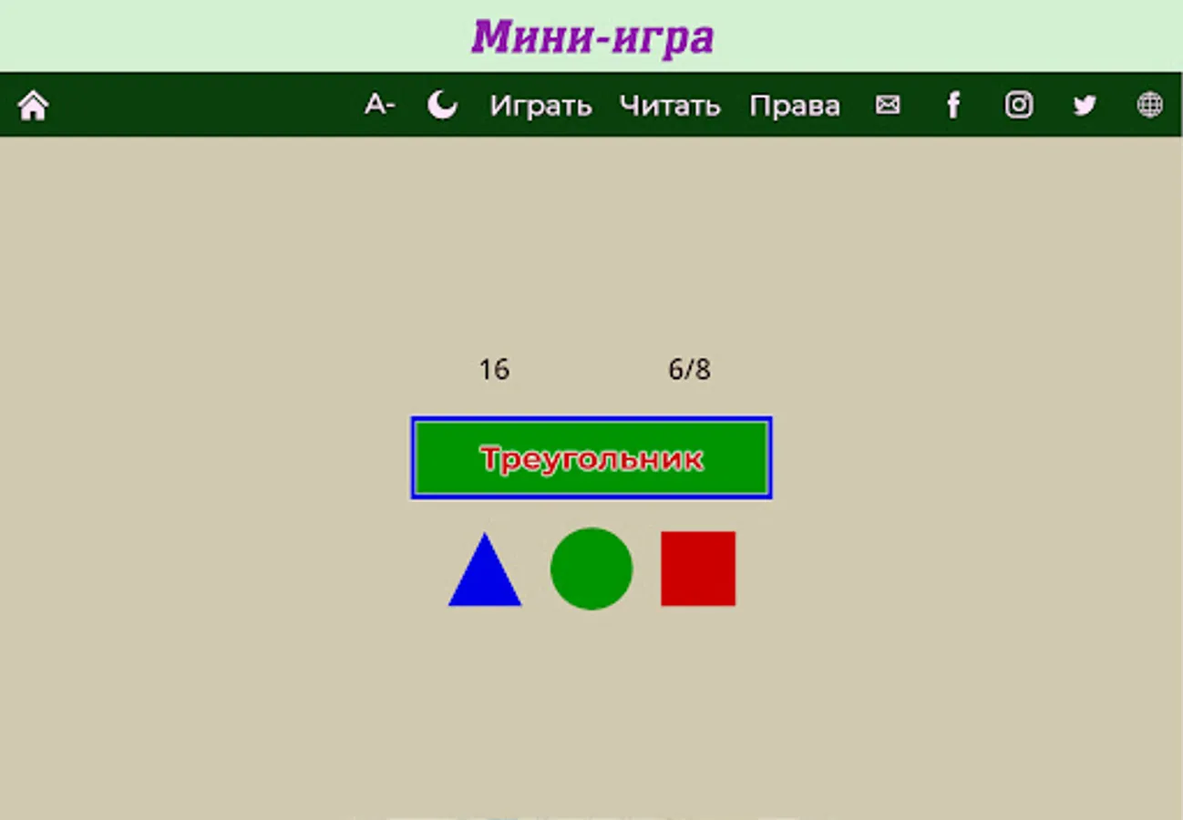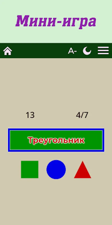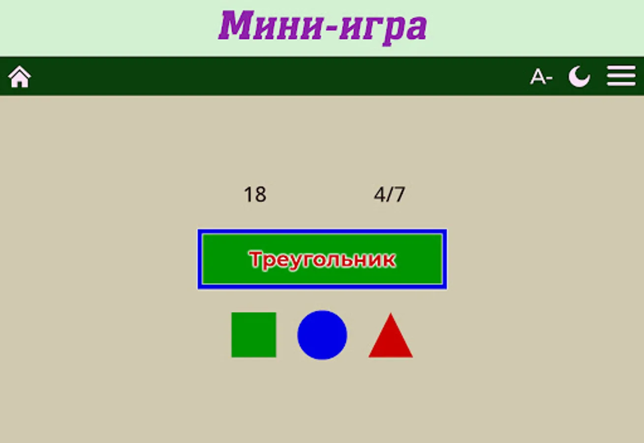 This is an attention game "Shapes". Within 30 seconds, the names of the shapes will appear one at a time. Choose a shape from the palette that matches the name.