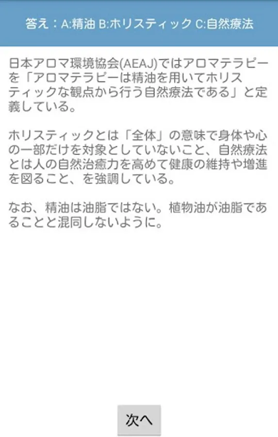 アロマテラピー検定は香りを嗅ぎ分ける試験のようにきこえますが、実際の試験で出題されるのはほぼ全てが知識問題です。解説を丁寧に書いたので、このアプリ1つで合格できるようにしました。