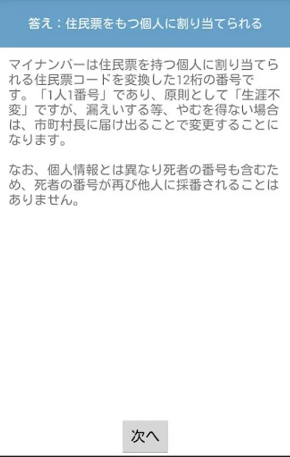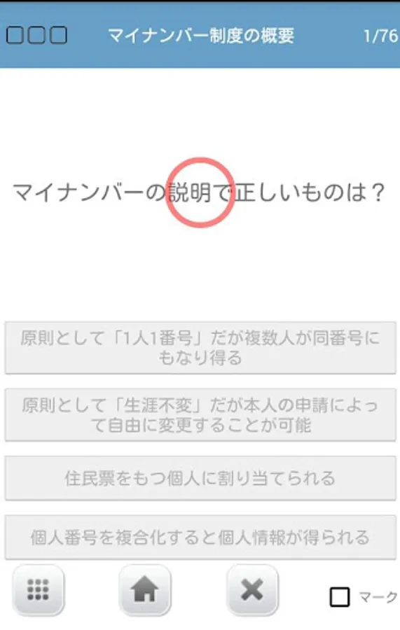 マイナンバー検定は公式問題集が存在しないため、テキストベースで学習をすることになります。そこで四択で電車の中でも手軽に学習できるアプリを作成しました。