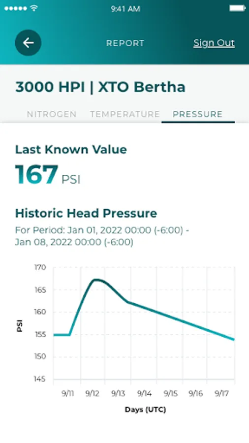 A mobile app designed for individuals in the field looking to track their operation's reductions in emissions and view corresponding equipment performance metrics for their Nitrogen tank hardware.