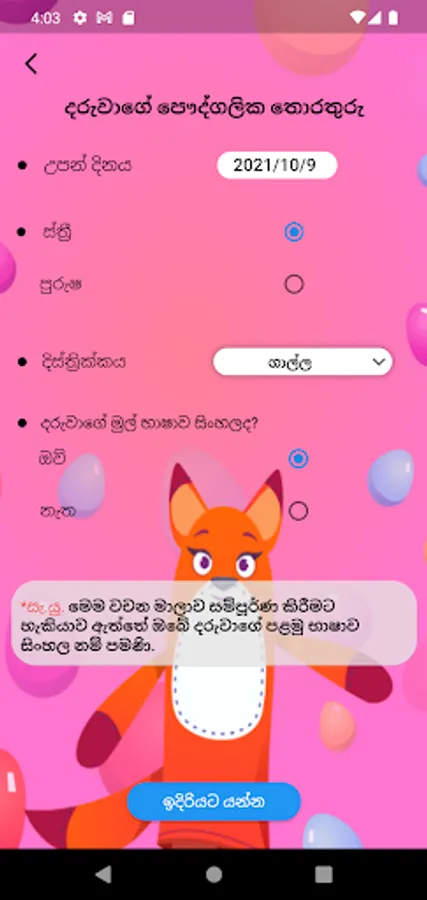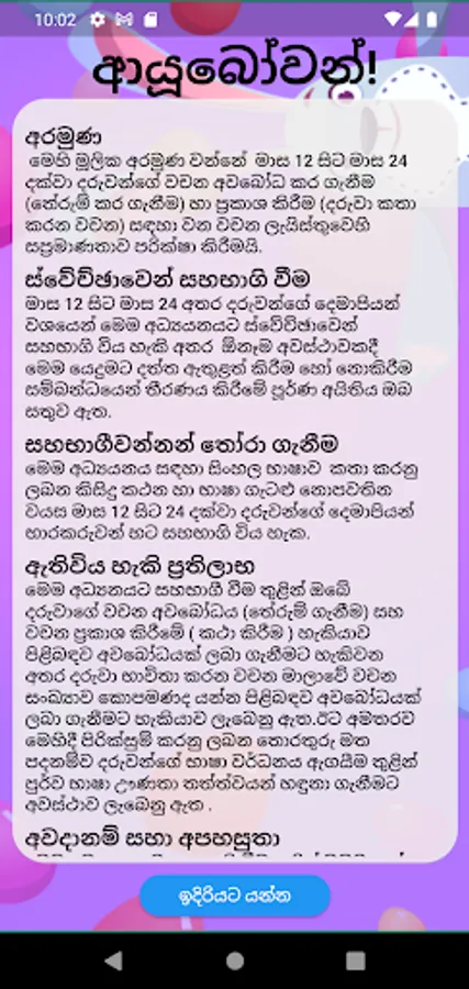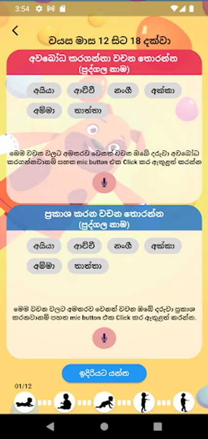 The “ Kathana” app assists parents in finding out about their child’s understanding and production of words in Sinhala. It can be used with children between 12-24 months of age.