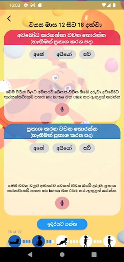 Word lists are provided for each category to test the words your child understands and says in Sinhala. It also allows you to record words to add any additional words that your child understands and expresses that are not included in the original list.