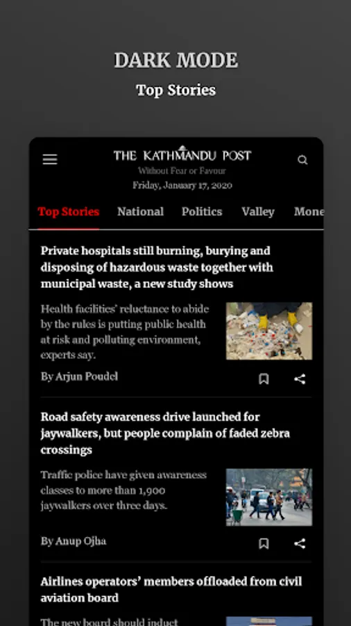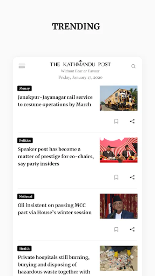 The official news app of the Kathmandu Post, Nepal’s largest English-language daily, with newly redesigned experience for breaking news & opinion, in-depth stories, news clips and individual profiles.