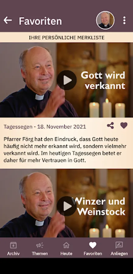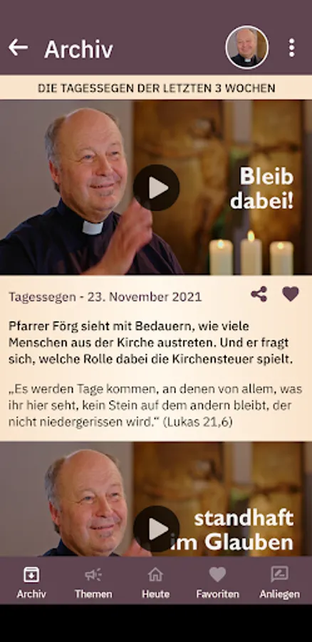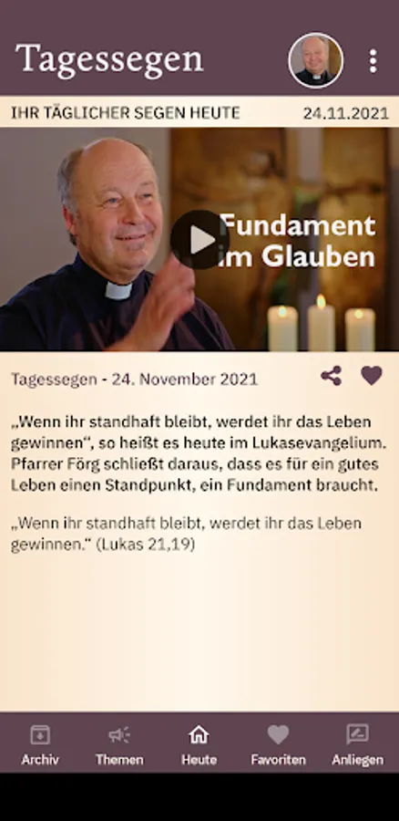 The daily blessing of the Catholic radio and television work is a daily, spiritual impulse in video format. Pastor Heinz Förg preaches briefly about the gospel or the reading of the day and then asks the audience for a blessing.
