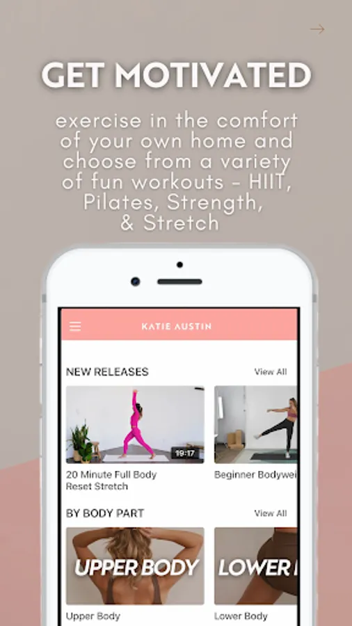 Katie Austin, global fitness personality & Sports Illustrated Swimsuit model, has created a place for you to easily access hundreds of daily workouts, access hundreds of healthy recipes and practical lifestyle tips to stay fit. Join the community today, and workout with Katie on-demand in the privacy of your own home. Choose from a wide variety of workouts- from booty, abs, dance, yoga, Pilates, HIIT, and more - or follow the Daily Workout Calendar, as you get a schedule to follow daily. The most flexible workout program for you and your goals. It’s time to get FIT FOR YOU!