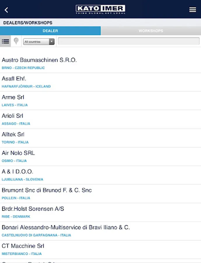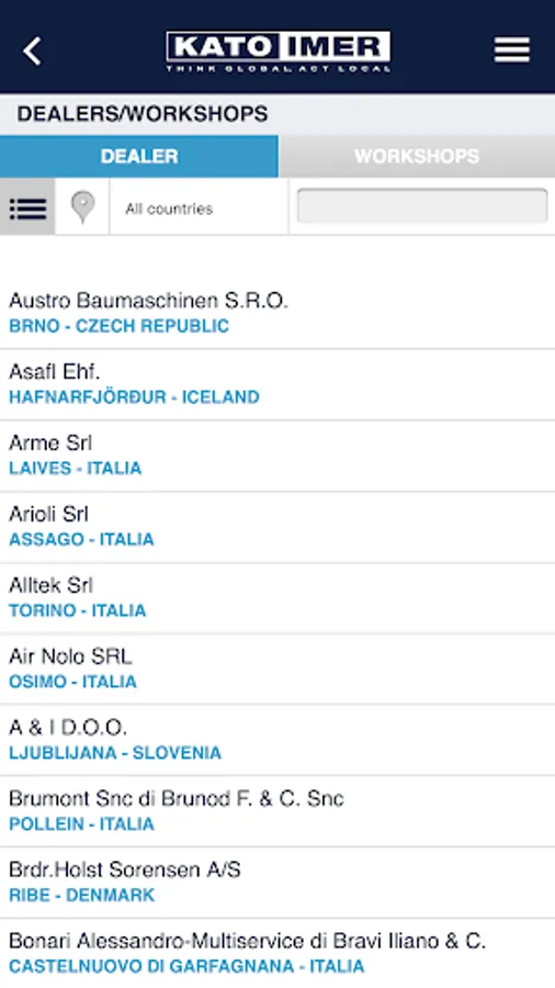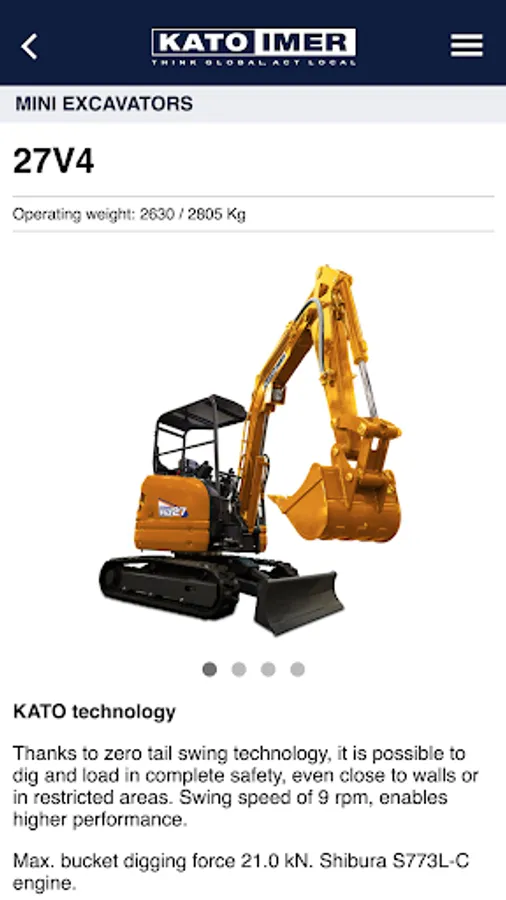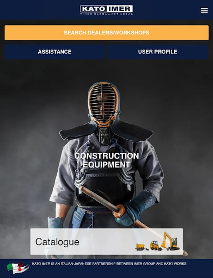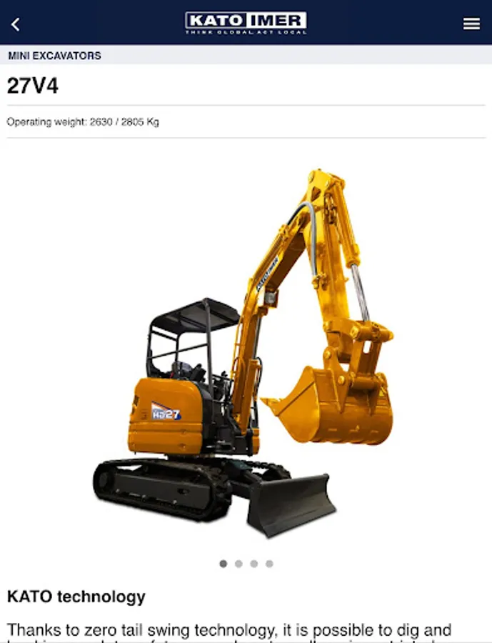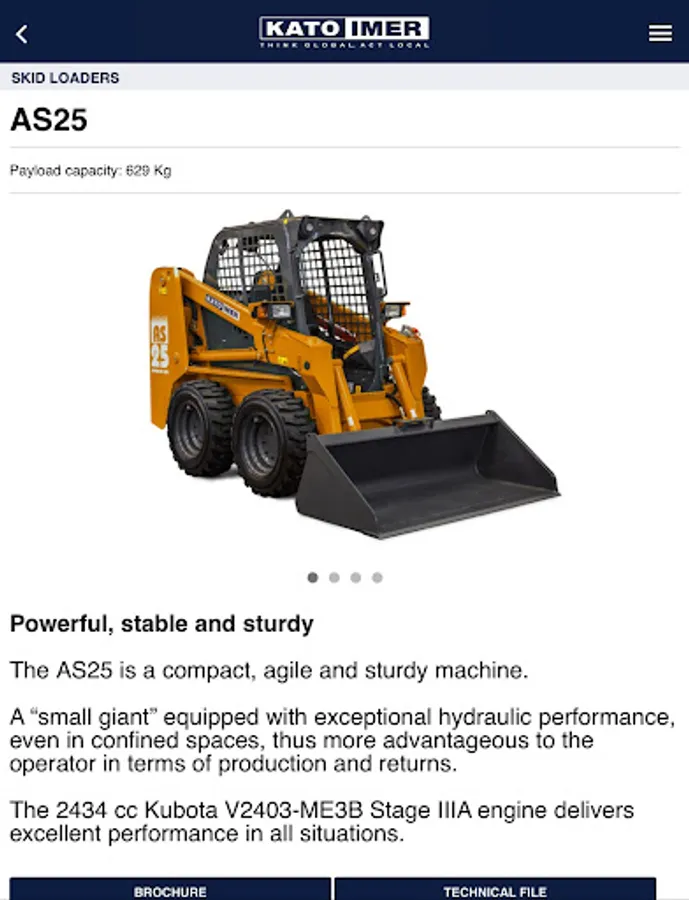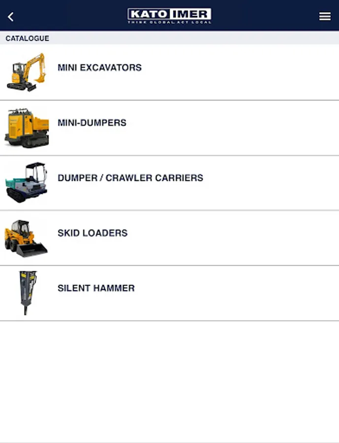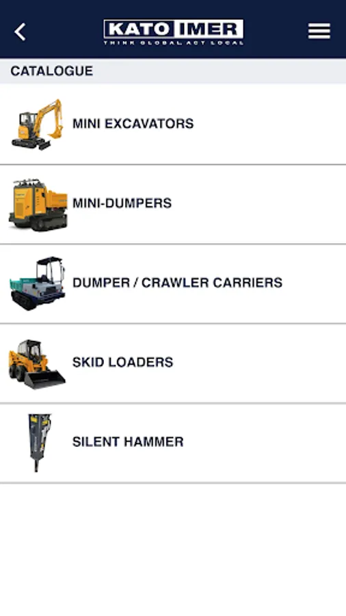 With the new KATO IMER app you can consult the entire product catalogue and download the related brochures and manuals. In the app you will find the complete list of dealers and workshops and their location on the map. You can also receive notifications on important updates published by the company, consult the FAQ and contact KATO IMER directly. Lastly, the reserved area allows you to register your machines and download the related documents (Technical Data Sheet and Brochure) and request the Operating Manual.