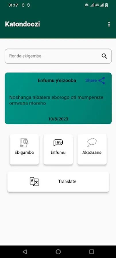 Katondoozi is a comprehensive and easy-to-use Runyankore - Rukiga application that provides users with accurate and up-to-date definitions for a wide range of Runyankore -Rukiga words, phrases, proverbs and ability to translate to and from English