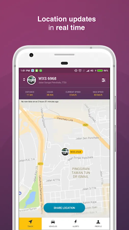 - receive notifications when vehicle starts, enters a checkpoint, exits a certain area or having low battery.