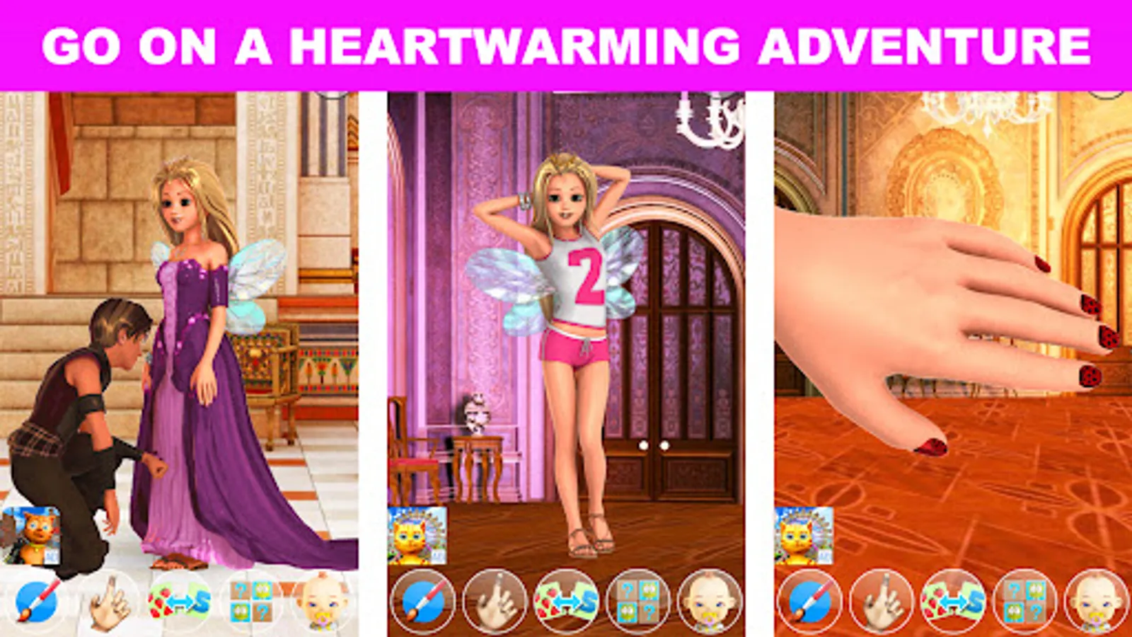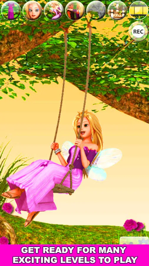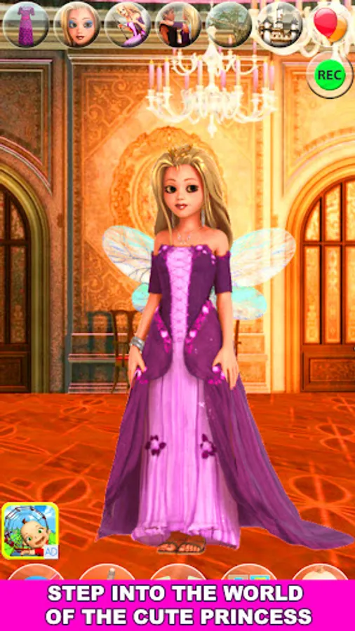 Just talk to the beautiful fairy talking princess. She answers with her charming voice and reacts to what you say or your touch. Push the princess on her swing or choose the clothes that she can wear, she will love to spend her time with you. In addition, you can visit with her various landscapes and meet her pretty animal friends.