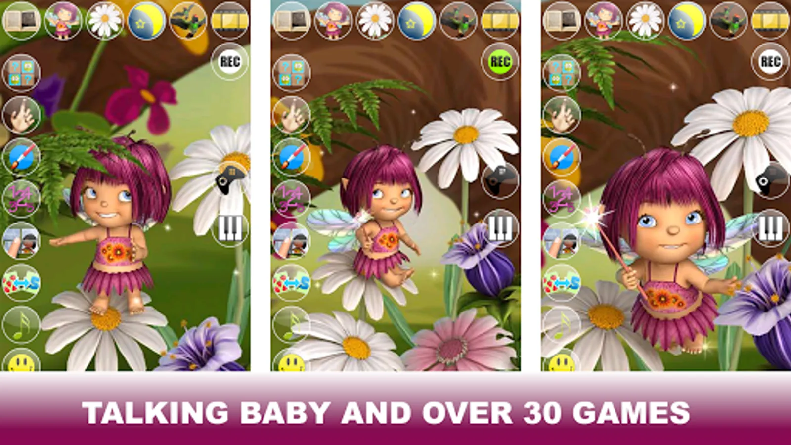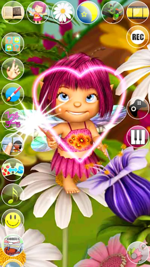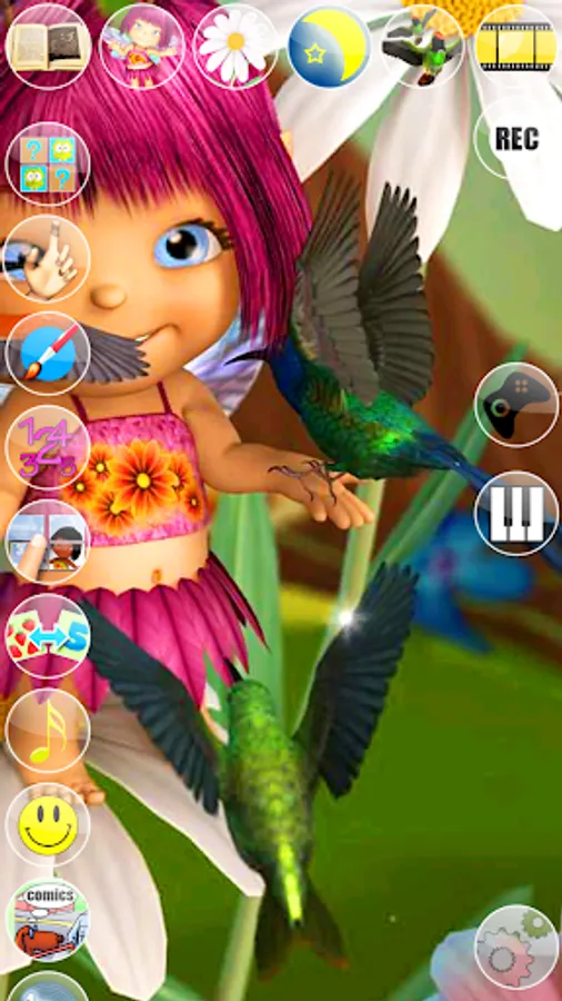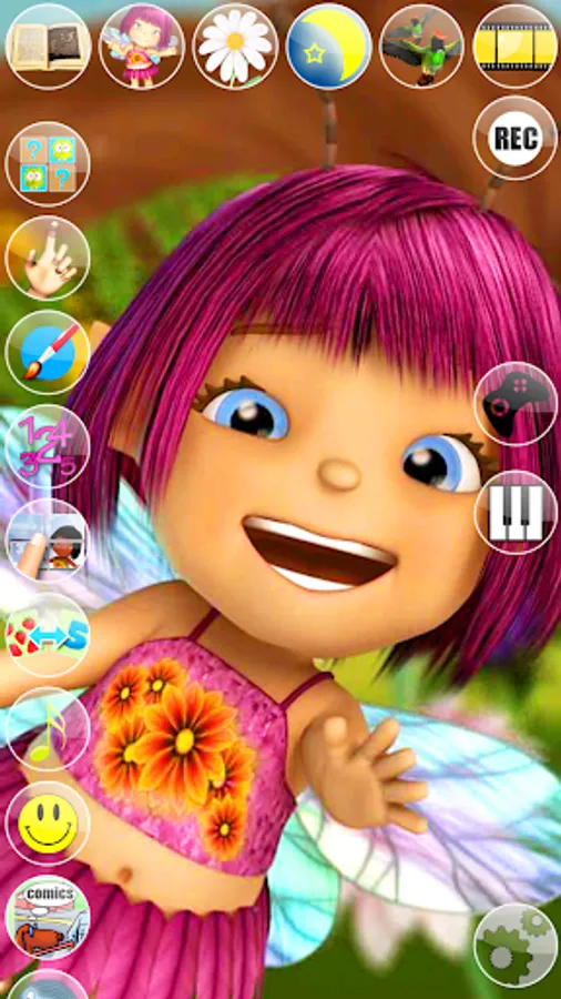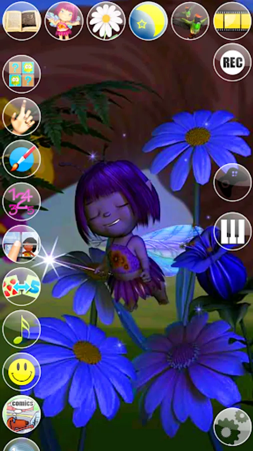 Discover Mary’s enchanted world and get to know her better. Talk to Mary, she will repeat everything with her cute voice and respond to your touch. Mary is still a little fairy apprentice and has a long way to go before she will become a powerful fairy, but every spell she does is made with love. Follow her and she will show you what she can do with her little magic wand. She will bring more light in the field by changing the color of the flowers, blowing some sparkling bubbles and sending out some magic kisses. While playing and flying around she will also get a visit from some curious tiny birds that will entertain her a bit. After such a hard day it is about time to go to sleep but not without a proper fairy tale and 2 or 3 pretty lullabies.