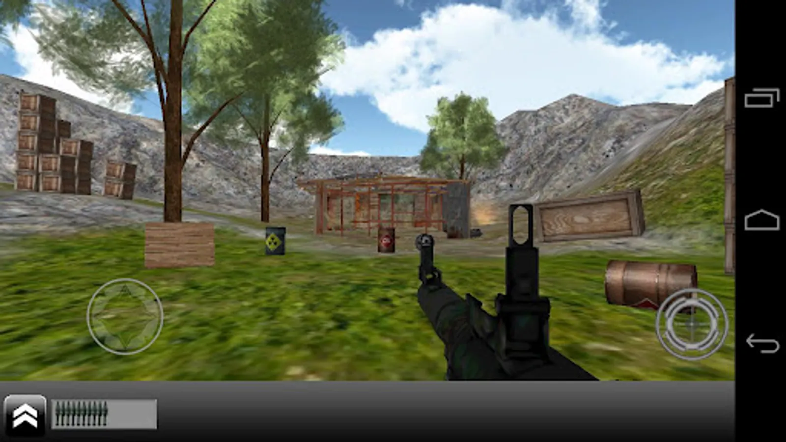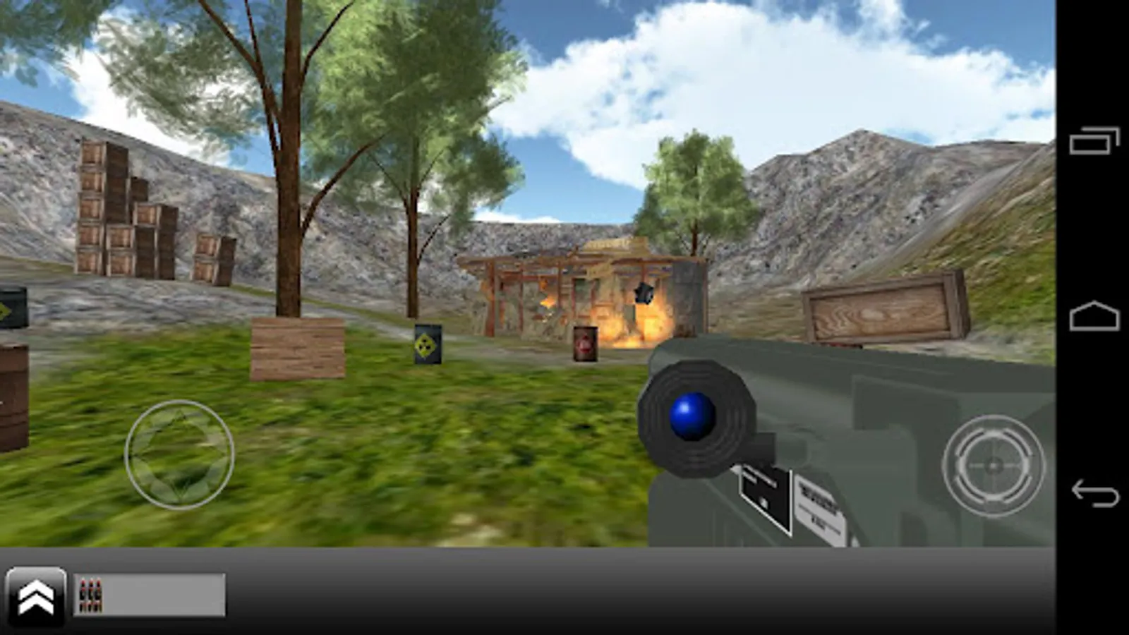 You have the possibility to fire with all the guns and destroy the scene. You can destroy boxes, a barrack, pallets, car, minibus etc.