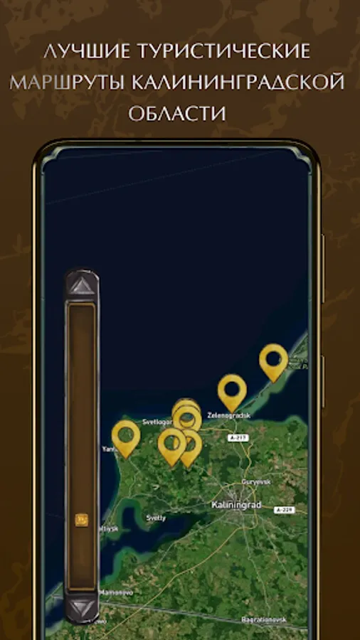 Application guide for tourist routes in the Kaliningrad region and Poland. The application includes 12 tourist routes from more than 120 tourist points.