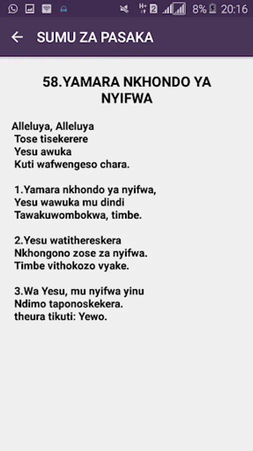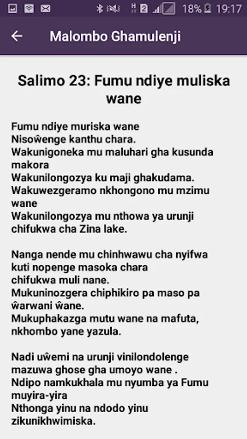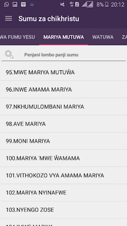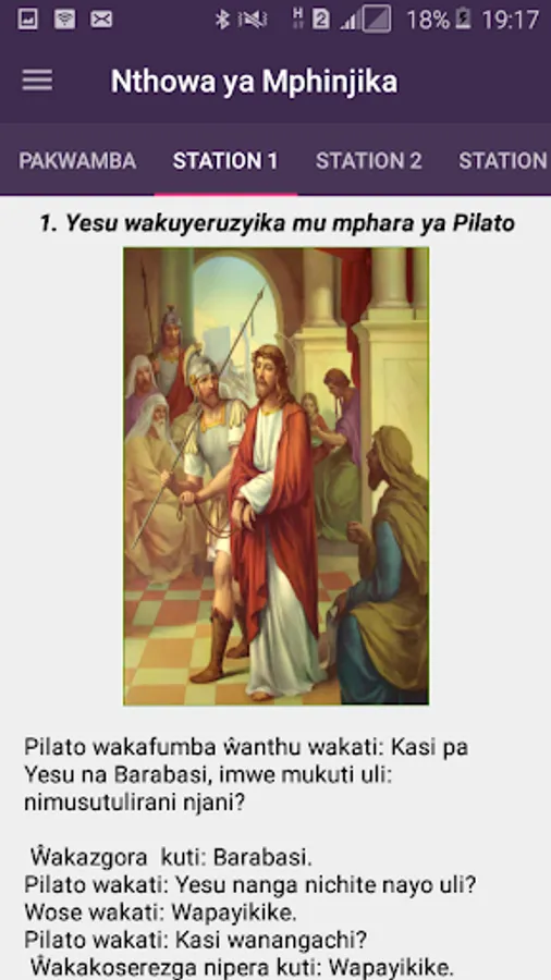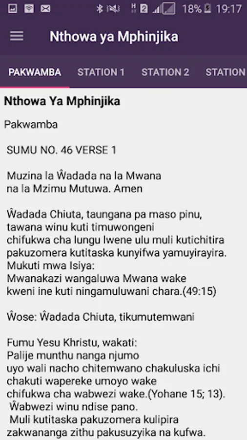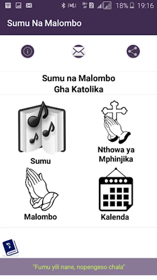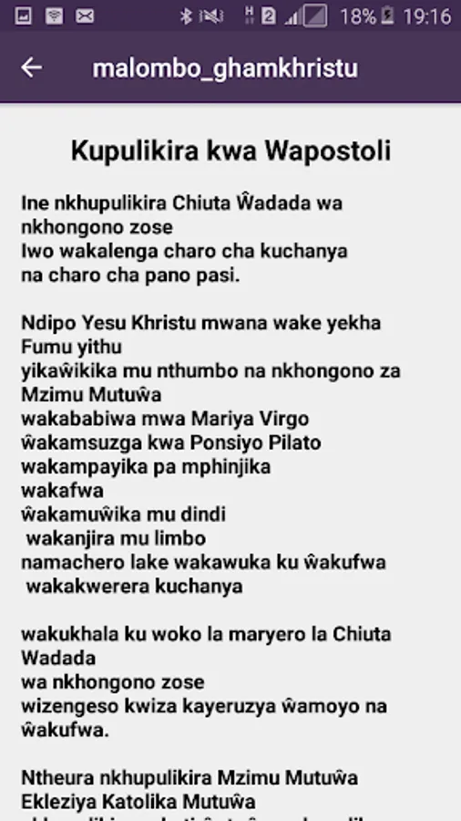 The application includes Tumbuka Catholic hymns, prayers, the way of the cross and the 2019 Liturgical Calendar for daily readings.