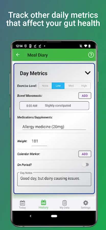 Tummy Tamer helps you get a clear picture of digestive issues. Easily track your food and drink intake, along with other metrics that affect your gut like stress, exercise, medications, and BMs. Quickly see how certain meals made you feel with color-coded graphs so you can spot trends and patterns. The path to digestive health starts with good record-keeping, and Tummy Tamer is here to make it simple.