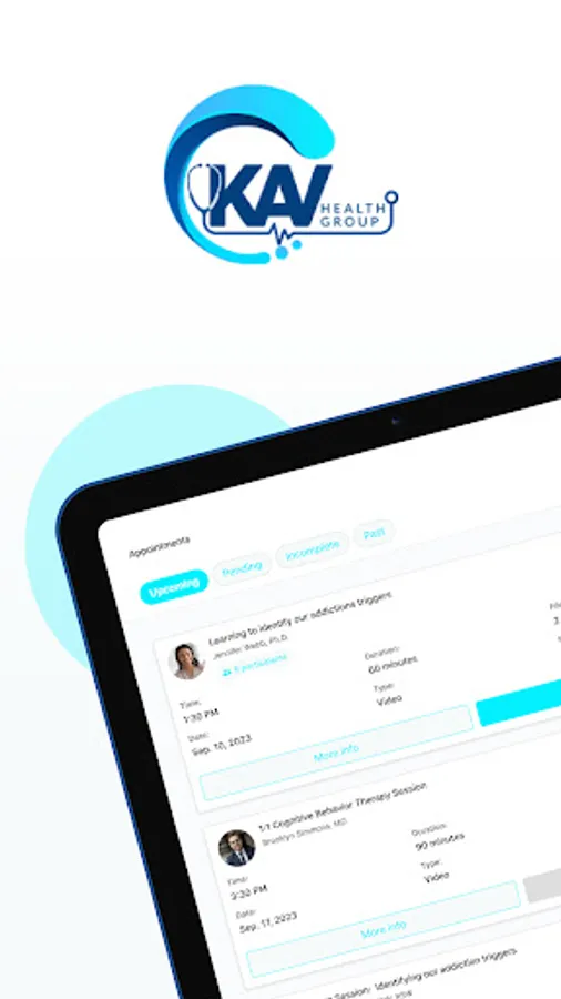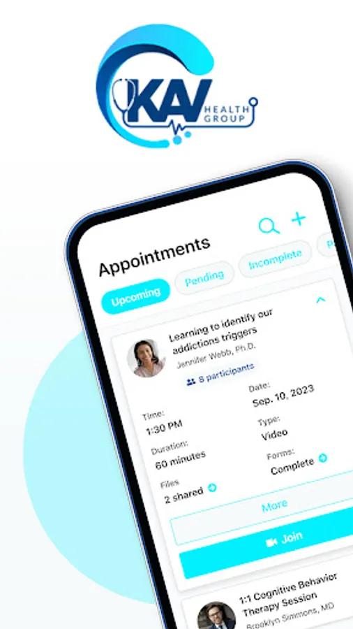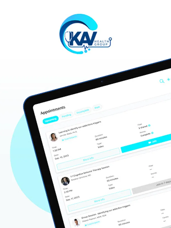 KAV Health Group, telemedicine substance abuse and mental health treatment. Full medical and clinical services utilizing telemedicine allowing private and discreet treatment for substance use disorder and mental health. Treatment from the comfort of home, on the go or at the office using evidence based treatments. Book Counseling, medical and therapy appointments, fill out paperwork or use the patient portal through the app. Group counseling, individual therapy and medical appointments with licensed and trained professionals at your fingertips.