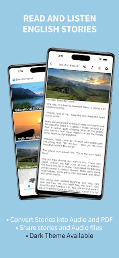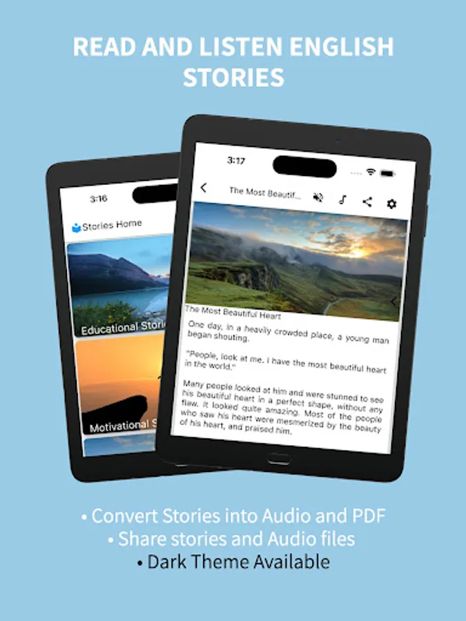 Read Listen English Stories ,English Stories for Kids, Audible English Stories app is a collection of Good Offline Stories that can be read, listen and convert in Audio by using Text to Speech (TTS) Technology .