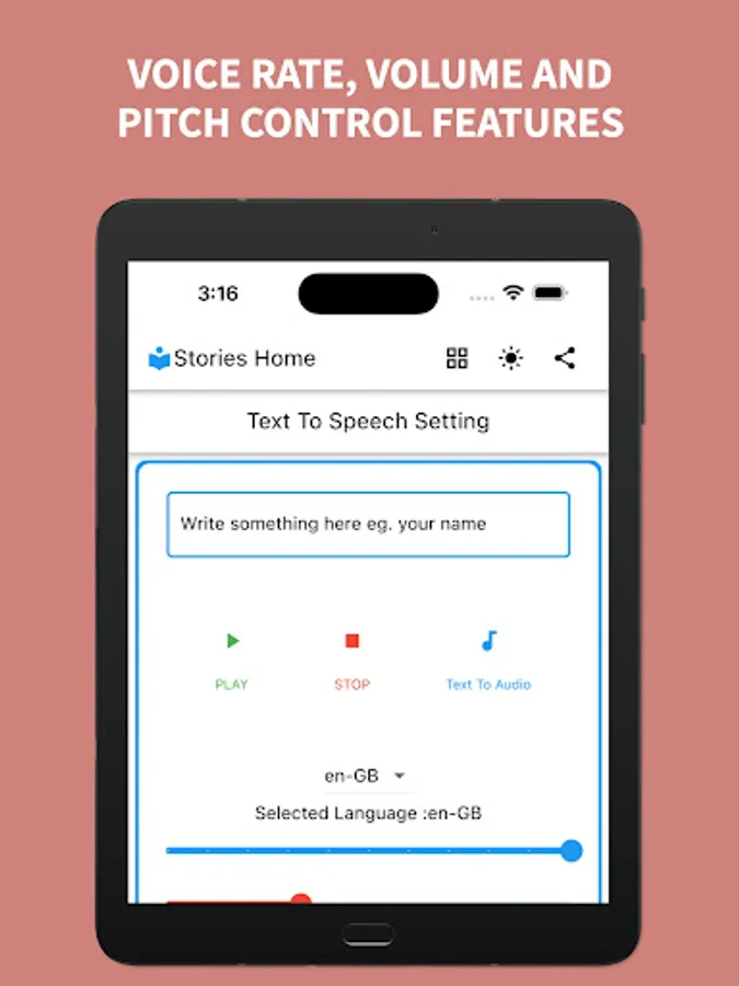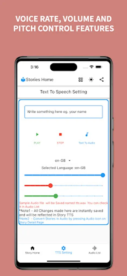 4. Customization: Control the speed & pitch of the voice. Set your preferred volume specifically for the app.