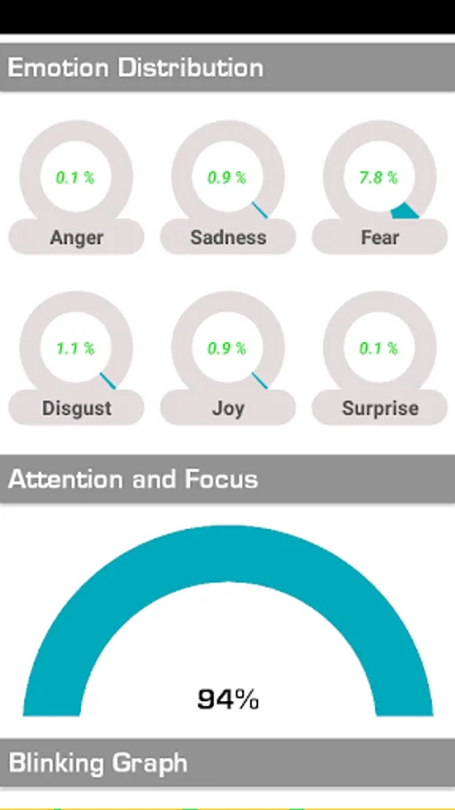The Job Interview Interpretation module allows the Evaluator to score the candidate interview and gives valuable information related to 6 possible Emotions (Joy, Surprise, Sadness, Anger, Disgust & Fear) generated for each question response, plus "Blink and Attention" graphs to analyze the "Best Candidate" for a position. All documented on video files for each question.