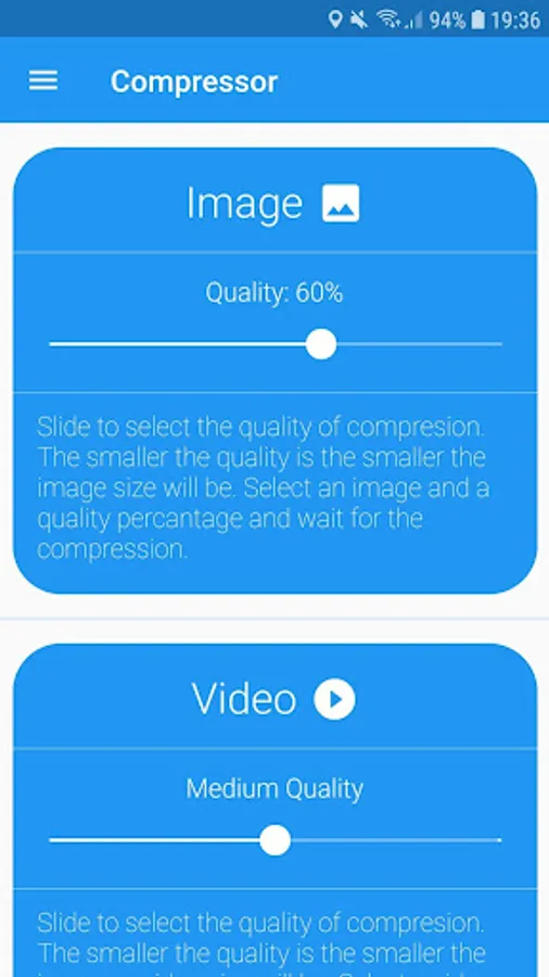 Compressor is a free compression app that compresses images with a select a quality for an image 📷 and video 📹. The images 📷 and videos 📹 will be saved to the gallery for users to view.