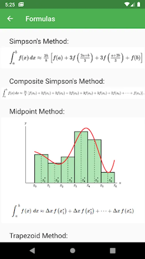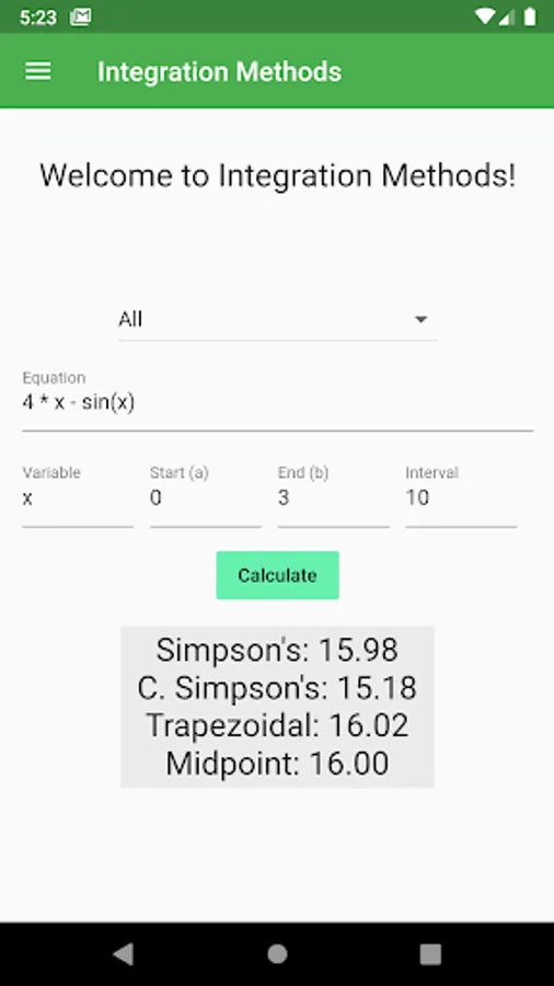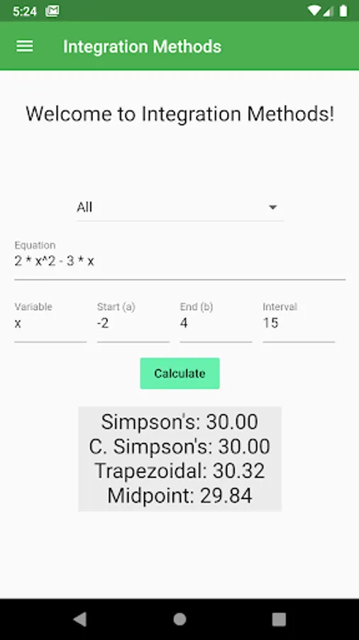Calculate integrals with the Simpson's Method, Trapezoidal Method, and Midpoint Method, and learn about these methods. Integration methods is an app designed to learn about numeric methods and compare their accuracy.