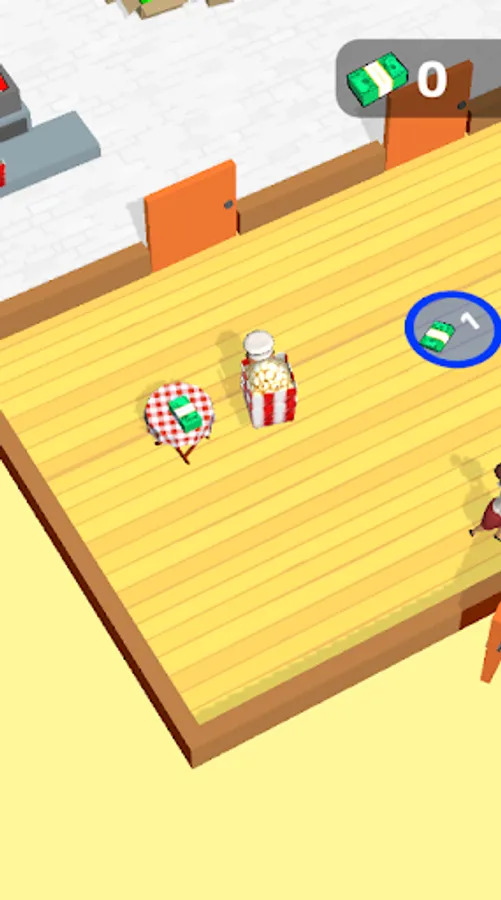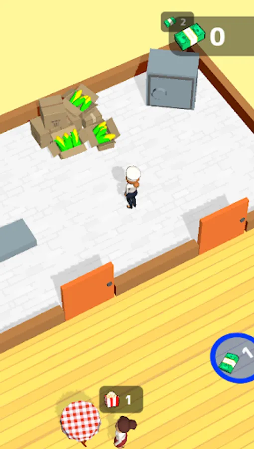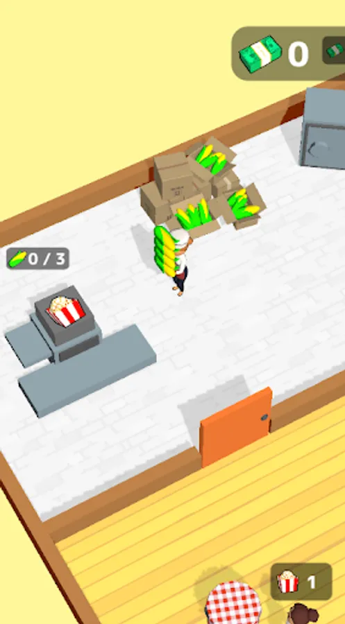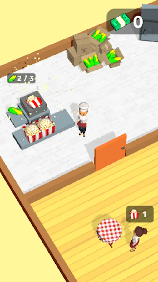 Put the corn into the popcorn making machine. Deliver the popcorn to the customers. When you get money, save it in the safe.