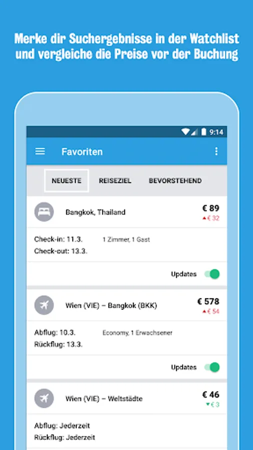 • We take over the search for you. Create a flight or hotel price alert and learn from us if the prices change.