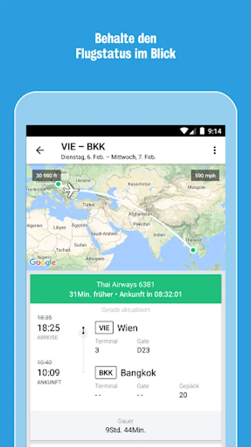 • countdown timer will inform you about your flight status and the remaining time of your stopovers.