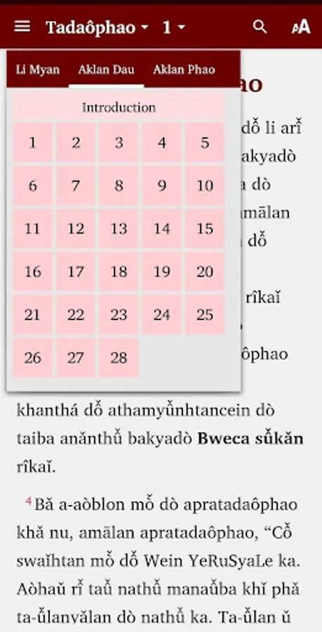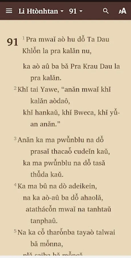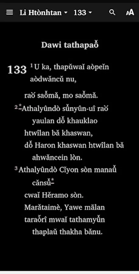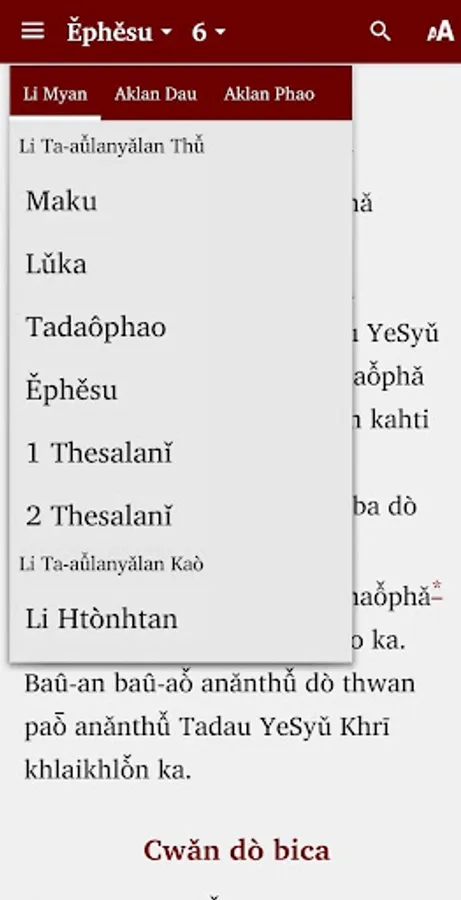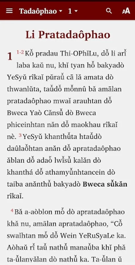 The Kayan Bible app contains the books of the Bible that have been translated so far by the Kayan Bible Translation Team: Luke, Acts, Romans, Ephesians, Colossians, and Psalms 90-150. (Mark, 1 & 2 Thessalonians have been translated but need to be improved for consistent spelling before publishing.)