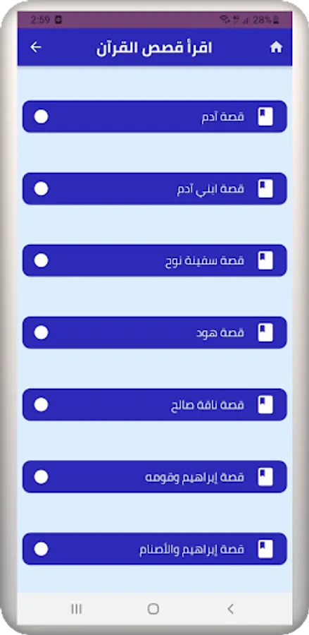 The application contains a collection of stories written for reading, namely: the story of Adam, the story of the two sons of Adam, the story of Noah's sophism, the story of Hood, the story of Saleh's camel, the story of Abraham and his people, the story of Abraham and the idols, the story of Abraham and Nimrod, the story of Abraham and Hagar, the story of Ismail's ram, the story of building the Kaaba, the story of Abraham's guest, the story of Lot, the story of Joseph's brothers, and the story of Joseph and the dear wife, the story of Joseph the prisoner, the story of the king's vision, the story of Joseph the minister, the story of the meeting, the story of Shuaib, the story of Job, the story of Moses' birth, the story of Moses' exodus to Midian, the story of Moses' stick, the story of the believer of Pharaoh's family, the story of Pharaoh's destruction, the story of the calf of the children of Israel, and the story of the cow of the children of Israel.