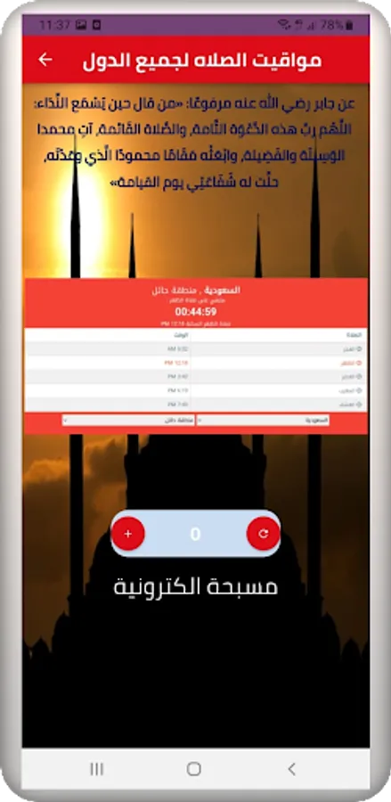This application contains times and times of prayer in each country by selecting the country and the city, and the application also contains a digital electronic rosary and the call to prayer alert, this beautiful and simple application allows the Muslim to know that the world is with the timing of prayer at all times and in every place, as well as knowing the timing of Ramadan