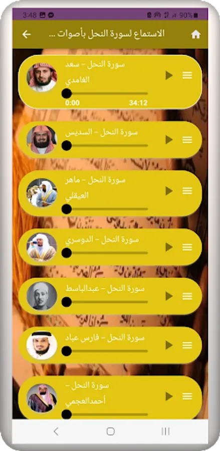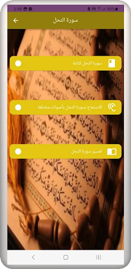 This application contains Surah Al-Nahl from the Holy Qur’an written for reading, as well as a voice for listening with more than one voice, including Abdul Rahman Al-Sudais, Saad Al-Ghamdi, Maher Al-Muaiqly, Faris Abbad, Ahmed Al-Ajmi, Abdul Basit Abdul Samad, Meshary Al-Afasy and Yasser Al-Dossary. The application also contains an interpretation of this noble surah