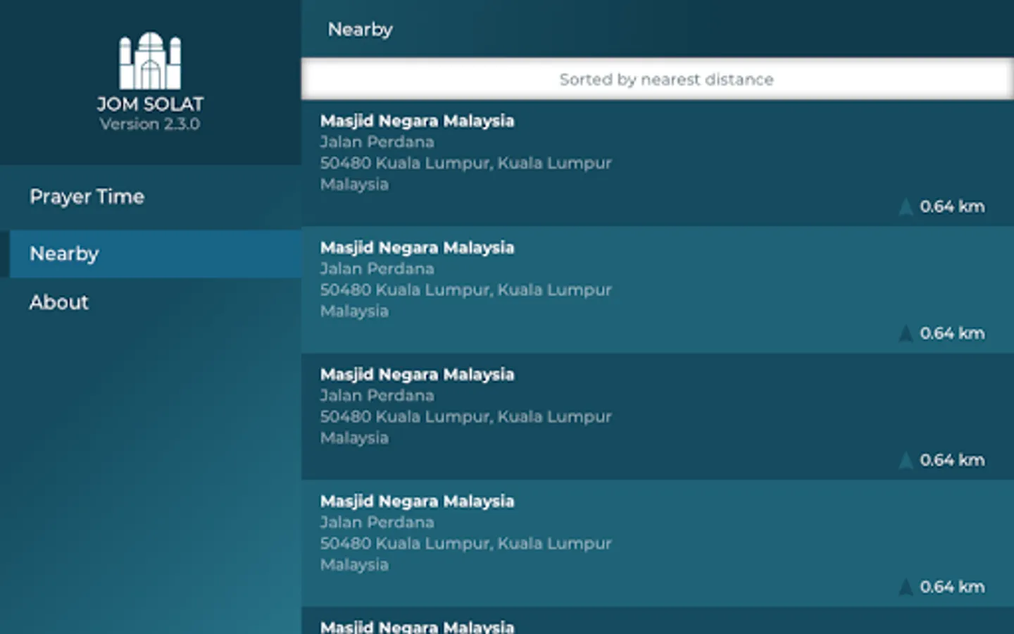 • Lihat senarai masjid berdekatan anda dan navigasi menggunakan aplikasi navigasi pilihan anda