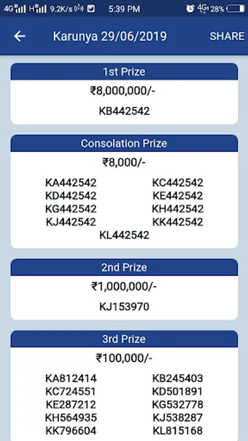 This application publish live Kerala lottery results.we can also search for previous results. We can use this easily and simply. As an advantage automatic updation occur daily. Unnecessary notification will not be provided and only use less mobile data for daily updated results. This application can be run under any available network. It is 100% free service.