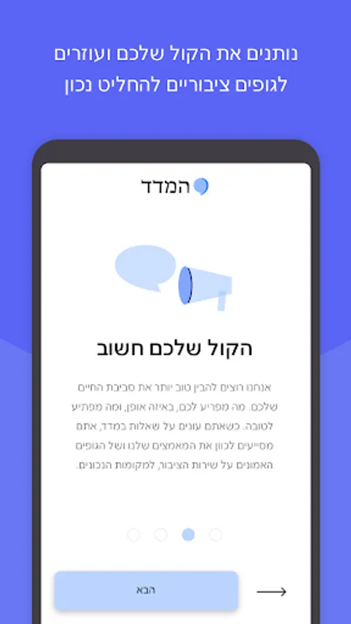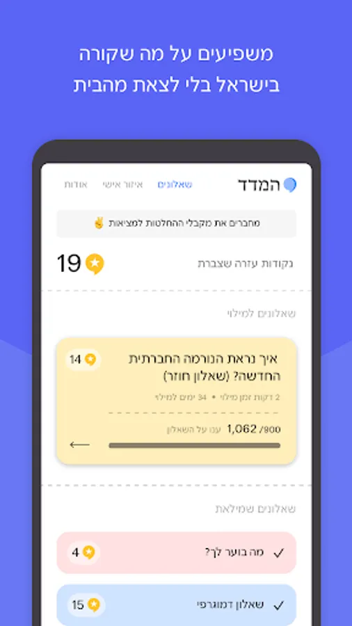 The measure is a social laboratory designed to help the influential public bodies in Israel make the right decisions in the areas of health, education, welfare and transport. You answer questions and help us to gain vital insights for setting an informed and fair policy in the center of people. Join our community of over 20,000 Israelis as they work toward a better Israeli reality.