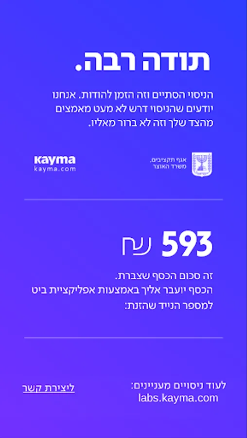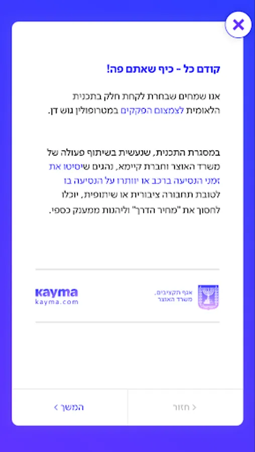 Please note that the experiment is intended for individuals with an Israeli driver's license and a private vehicle. To receive a registration code, sign up for our lab at labs.kayma.com