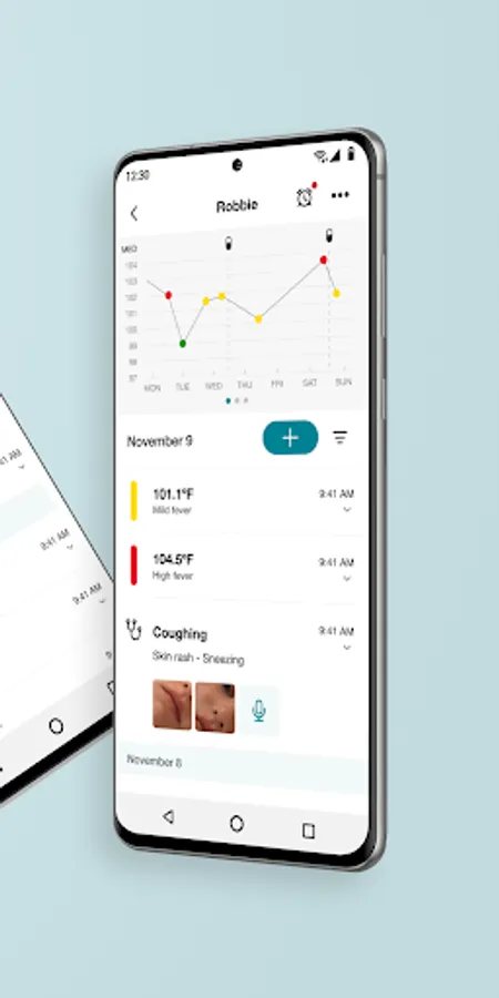 - Keep track of temperatures, medication intakes and symptoms in a convenient timeline format