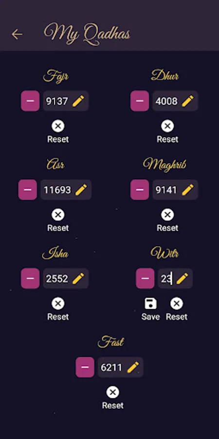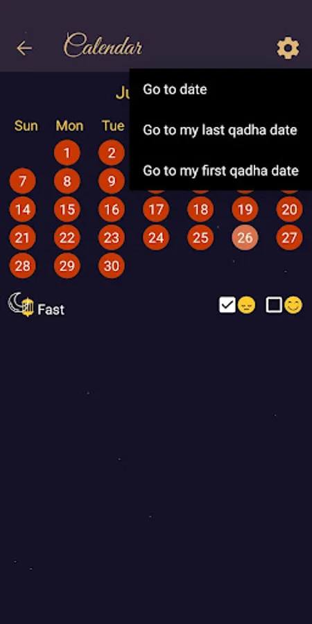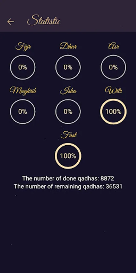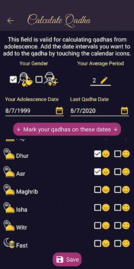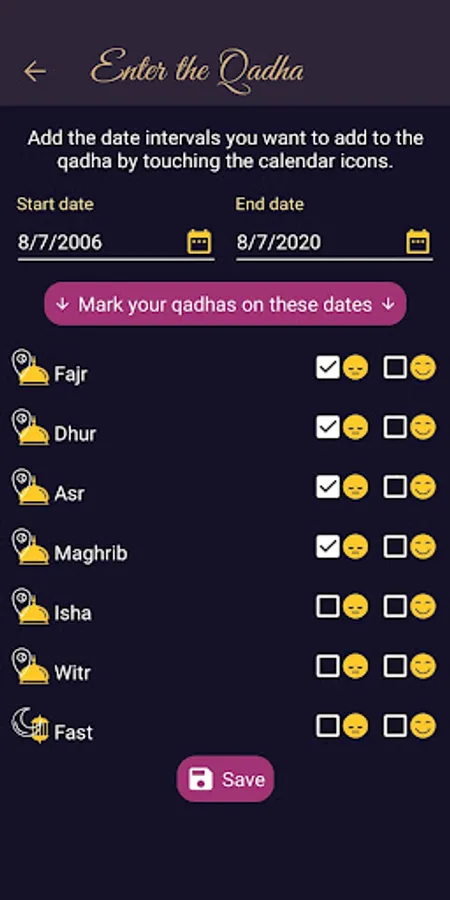 You can select the date ranges of your qadhas through QadhaMatic and record your actions directly on the calendar. With the Statistics and My Qadhas screens, you can graphically display your total and remaining qadhas. You can record and view the qadhas you have made.