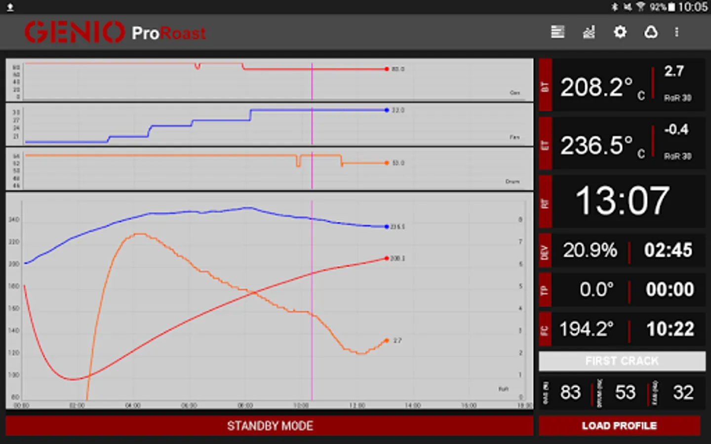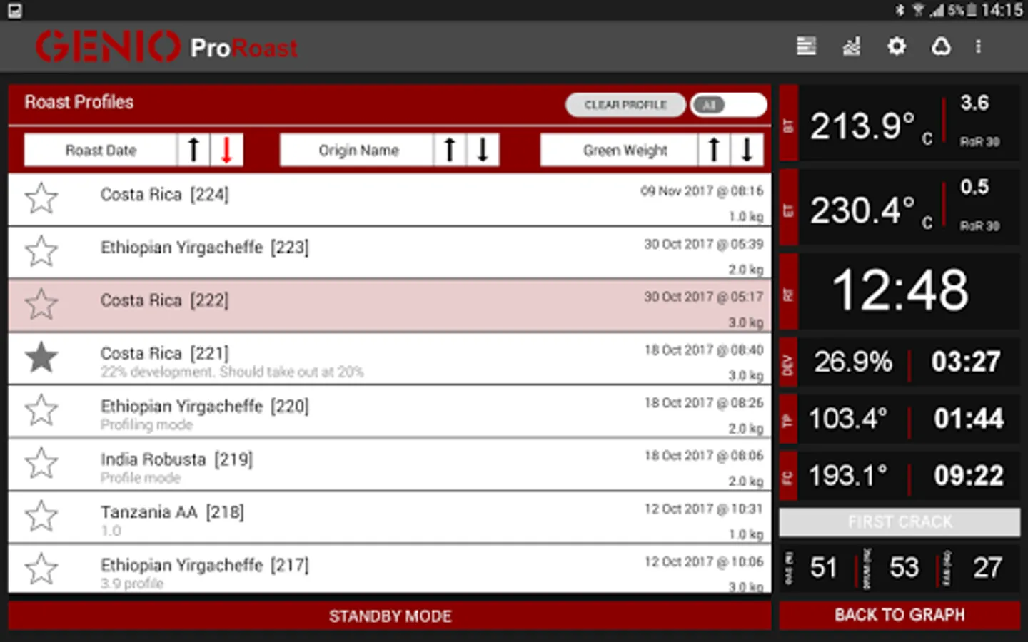 Operators can log several roast parameters during roasting including Bean Temperature, Environment Temperature, Bean Temperature Rate-of-Rise, Environment Temperature Rate-of-Rise, Gas Percentage, Fan Speed, Drum Speed, Turn Point Temperature and Time, First Crack Temperature and Time, Development Percentage and Time, and finally the roast time. Most of these parameters are logged on a graph, and this forms the roast profile. The roast profile is saved on to the device and can be loaded to recreate the profile using Genio Roasters’ Automation Features.