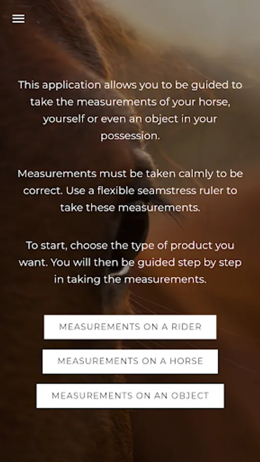 This application allows you to be guided to take the measurements of your horse or yourself.
