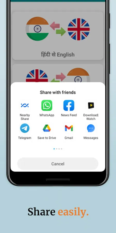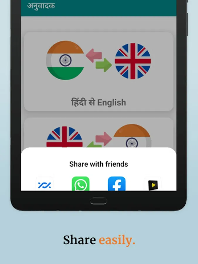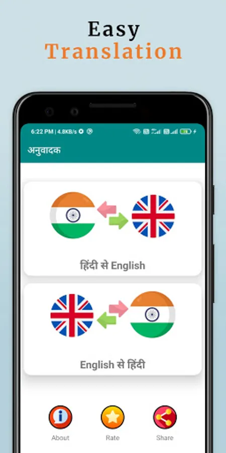 Easy Hindi to English and English to Hindi translator app is a easy to use tool for translation works. You can easily input any text in Hindi and it will output result in English text. You can use speach to text input feature also.