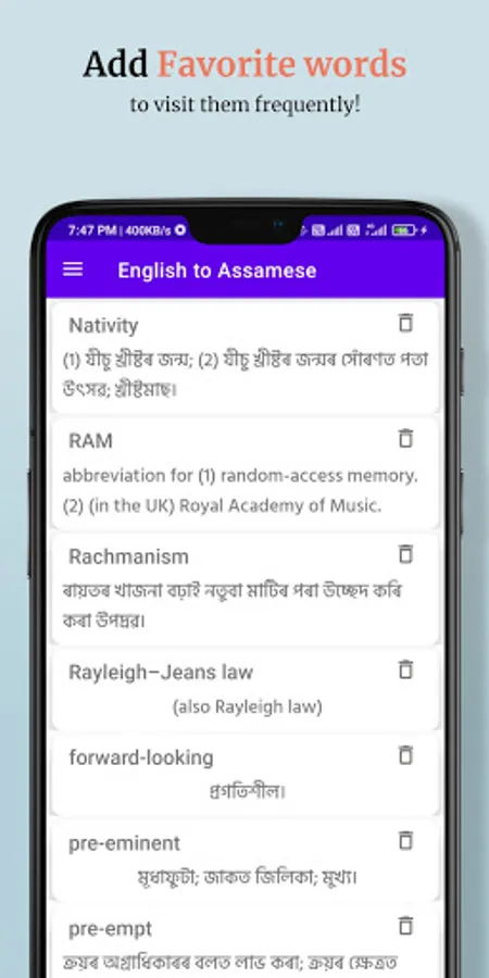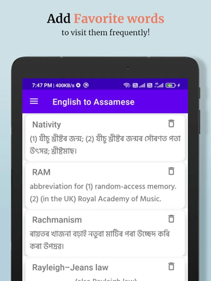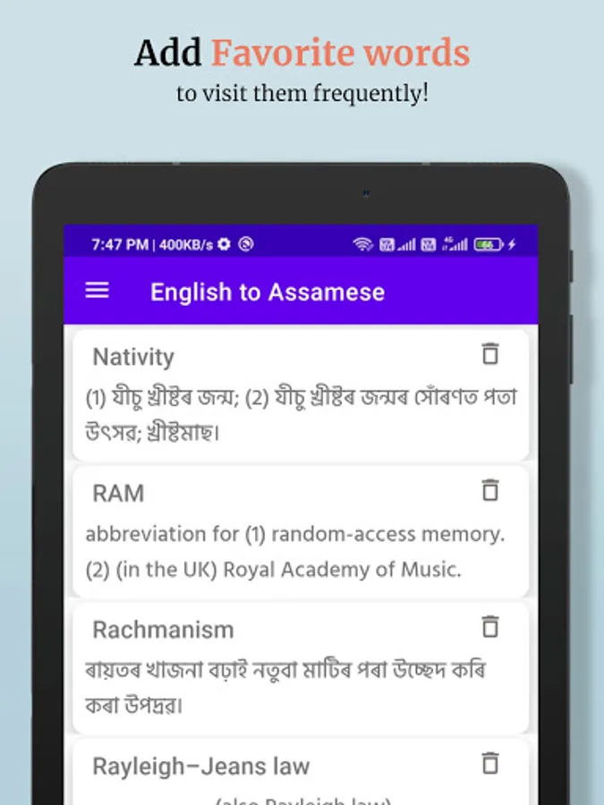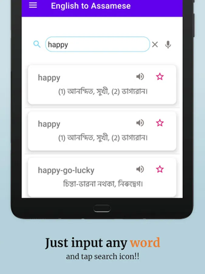 English to Assamese Dictionary is an easy to use dictionary app to learn English words and their Assamese meaning. It is completely Free to use.