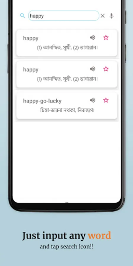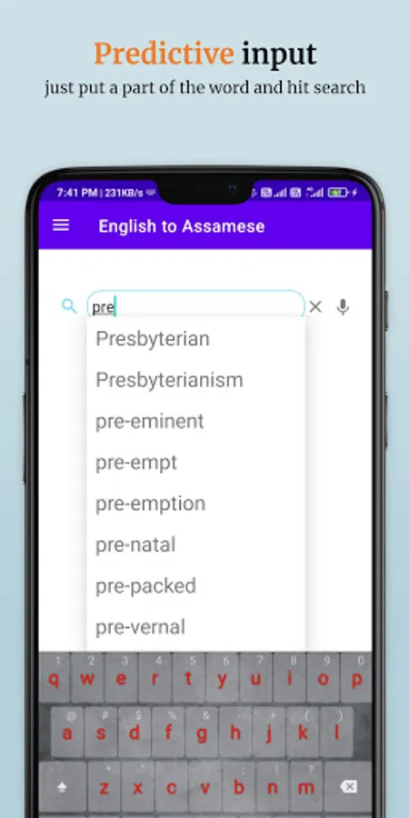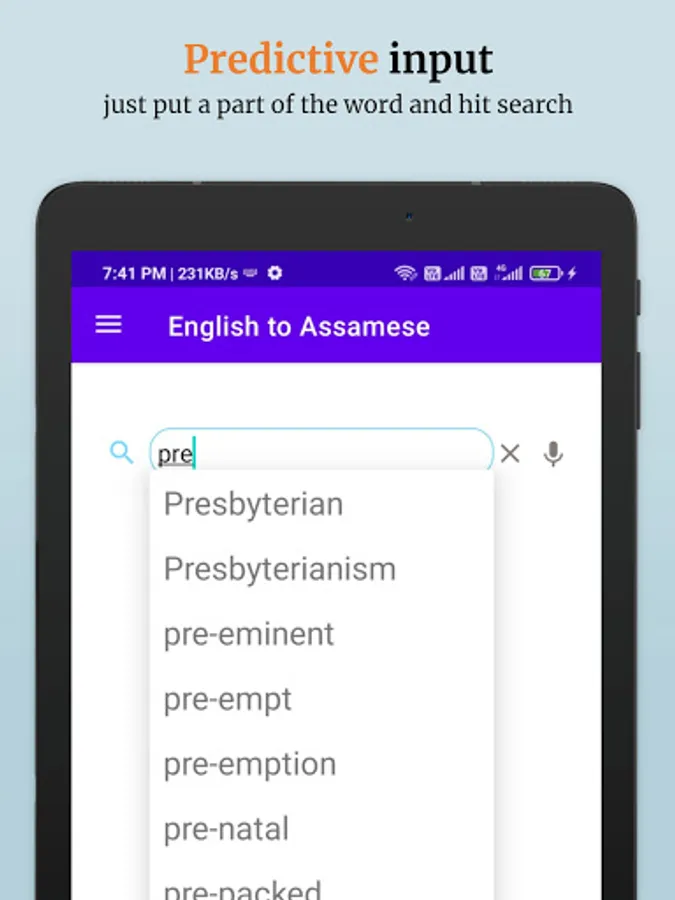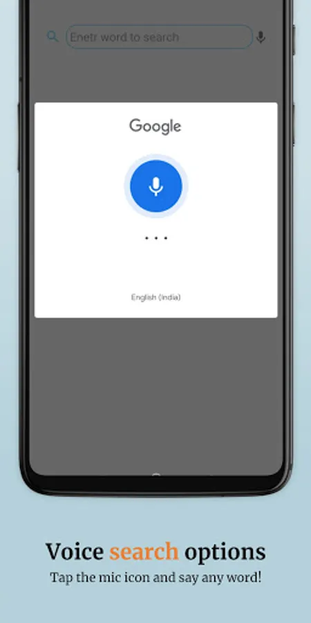 This dictionary contains 45,000+ words. To learn any word, just input in the search box and hit search. You can also search words using voice search. A word can be searched just by entering a few letters of the word and it will return all related words and their meanings.