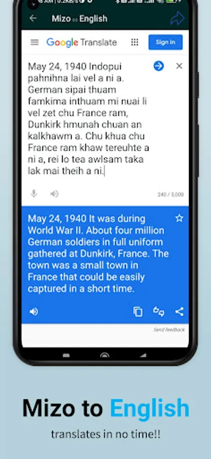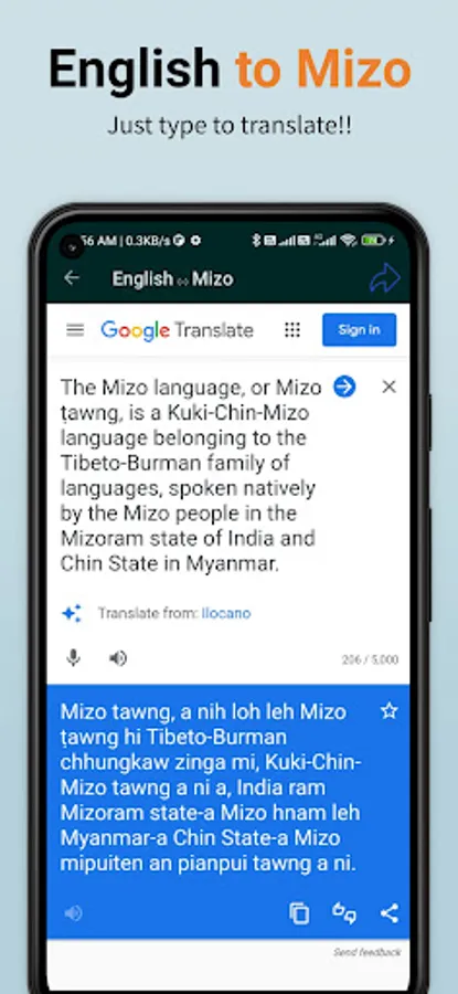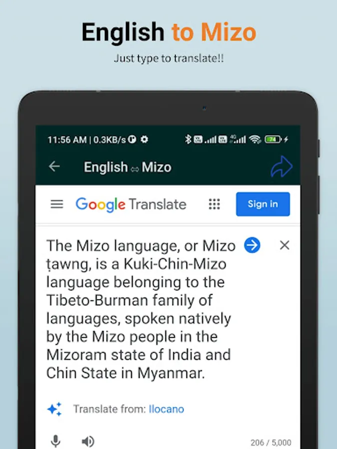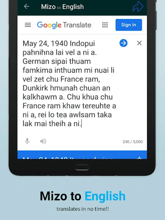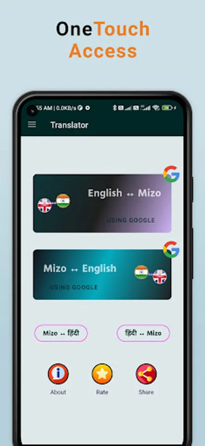 This easy Mizo to English and English to Mizo translator app is a easy to use tool for translation works. You can easily input any text in Mizo and it will output result in English text. This provides a one touch link to the Google's Mizo-English translation.