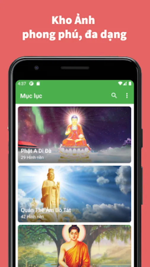 The application contains hundreds of images of Buddhas, making it easy for you to choose a beautiful picture as a wallpaper or to recite mantras or chant.