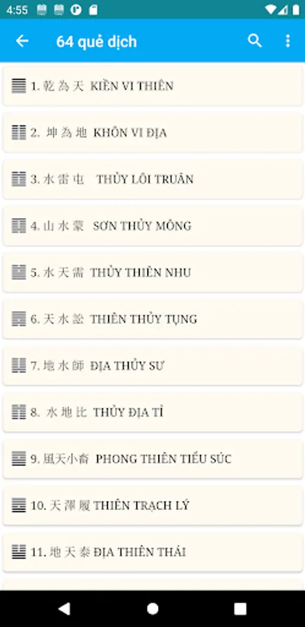 The 64 hexagram application is a convenient application that helps you look up, save and mark the 64 hexagrams.