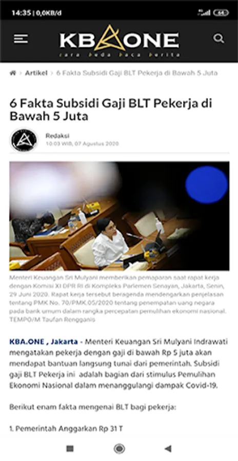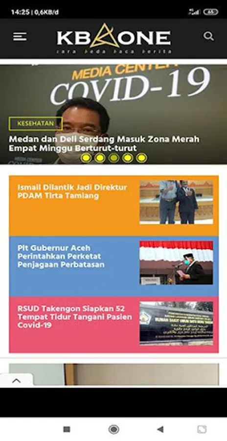 The KBA.one application is divided into news sections: Variety, Advertorial, Events, Entertainment, Environment, World, Business, Parliamentaria, City, Health, Nusantara, Education, Law, Gami Festival, Economy, Ceremonial, Aceh Government Info, Technology, Regions , Education, Politics, Sports, Crime.